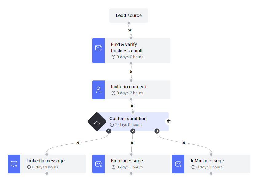 لقد قمت للتو بإنشاء شرط مخصص يغطي جميع السيناريوهات الممكنة ضمن تسلسلك. تتيح لك هذه الميزة تحسين جهود التواصل والاستفادة القصوى من Skylead. 🌟