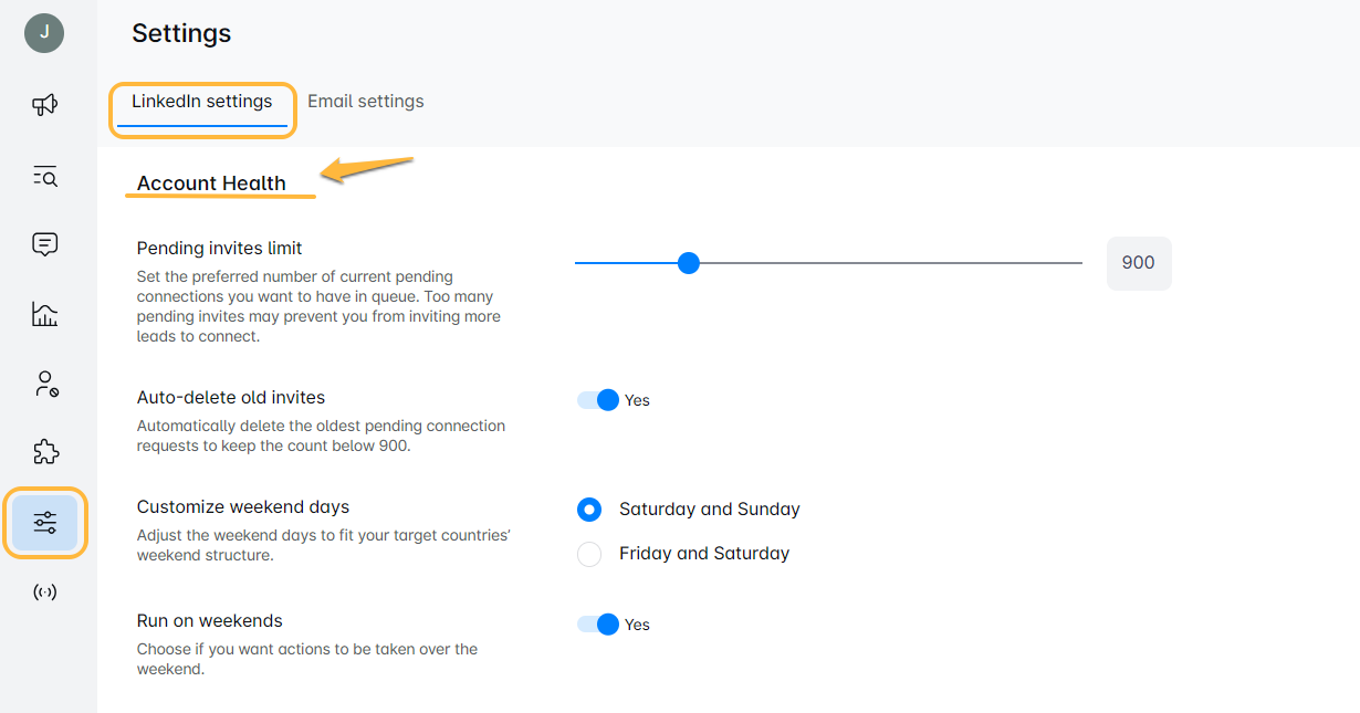 ¡Mantén un perfil de LinkedIn robusto con la configuración de Salud de la Cuenta! Gestiona las invitaciones pendientes, elimina automáticamente las solicitudes antiguas y personaliza la actividad de fin de semana para un enfoque equilibrado. LinkedIn valora las conexiones auténticas, así que manténlo natural para evitar restricciones. ¡Mantén todo en orden y feliz networking! 🤝📚
