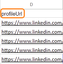 - Para una campaña combinada de email + LinkedIn, necesitarás dos columnas: una para direcciones de correo electrónico y otra para URLs de perfil de tus leads. Asegúrate de que la columna con URLs de perfil se llame exactamente profileUrl (con U en mayúscula).