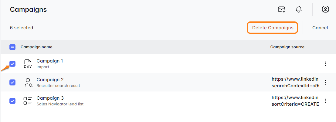 - Para eliminar varias campañas a la vez, selecciona las campañas que deseas eliminar y haz clic en el botón 'Eliminar campañas'.