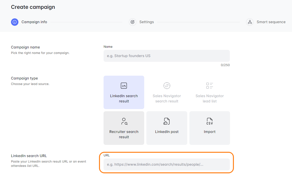 - A continuación, simplemente copia y pega la URL con tus nuevos resultados de búsqueda de LinkedIn. Alternativamente, puedes importar un archivo CSV, búsqueda en Sales Navigator, lista de prospectos, etc., en el paso de “Información de la Campaña”.