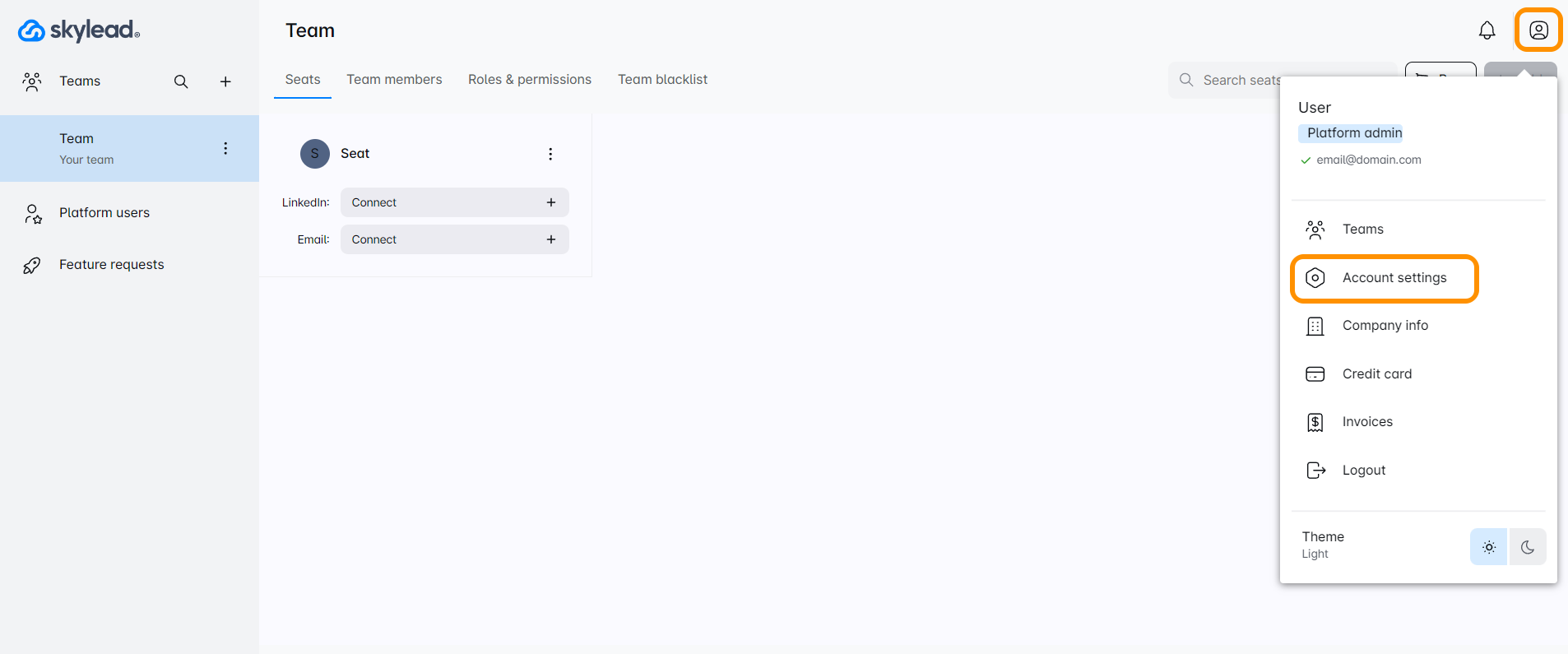 Pour commencer, rendez-vous sur votre tableau de bord d'équipe. Cliquez sur l'icône de votre compte puis allez dans Paramètres du compte pour trouver l'option de réchauffement d'email InboxFlare. Vous pourrez activer le réchauffement d'email uniquement si vous êtes propriétaire de l'équipe de cette équipe spécifique.