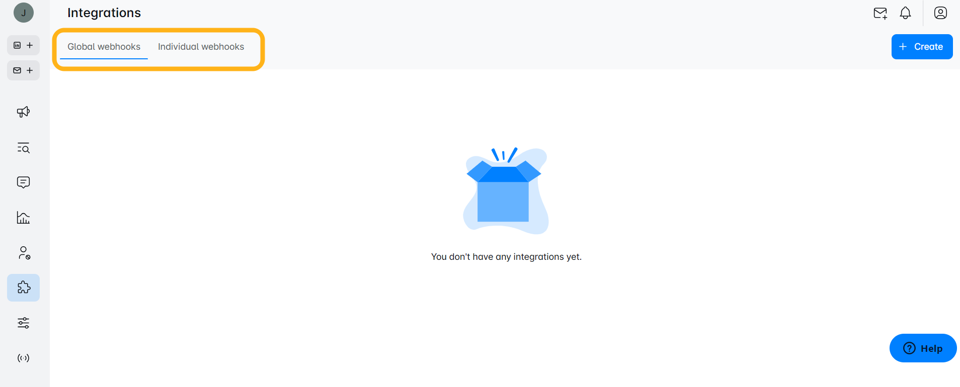 - Vous pouvez configurer un webhook pour toutes vos campagnes (Webhook global) ou pour des campagnes individuelles. Vous pouvez le faire en choisissant l'onglet Webhooks globaux ou individuels ci-dessous :