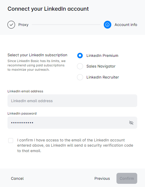 - अपने प्रॉक्सी का चयन करने के बाद, अपनी LinkedIn सदस्यता प्रकार दर्ज करें, फिर अपना LinkedIn ईमेल और पासवर्ड जोड़ें। 📧 यदि पिन के लिए कहा जाए, तो कनेक्शन को अंतिम रूप देने के लिए इसे दर्ज करें।