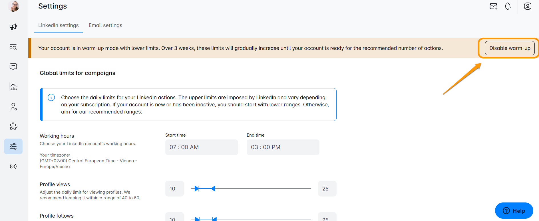 हर नया Skylead खाता वार्मअप मोड में शुरू होता है। यह विशेष मोड अभियानों के लिए वैश्विक सीमाओं के साथ काम करता है, जिसे आप सेटिंग्स टैब के तहत पाएंगे। यह Skylead के लिए एक कोमल परिचय की तरह है, जिससे सब कुछ शुरू से ही सुचारू रूप से चलता है।