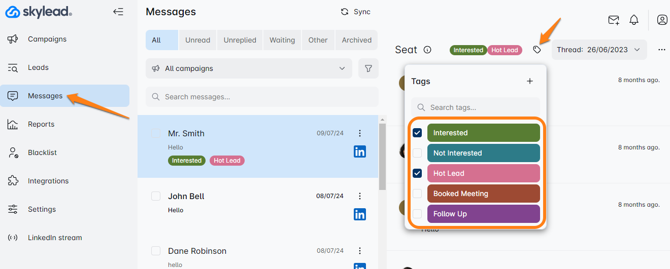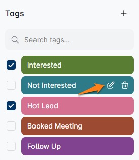 'लेबल्स' विकल्प पर क्लिक करें, और विभिन्न फ़िल्टर के साथ एक ड्रॉपडाउन मेनू पॉप अप होगा। पूर्वनिर्धारित लेबल्स में से चुनें जैसे 'Interested', 'Not Interested', 'Hot Lead', 'Booked Meeting', 'Follow Up', 'SPAM', और 'Wants to chat.'