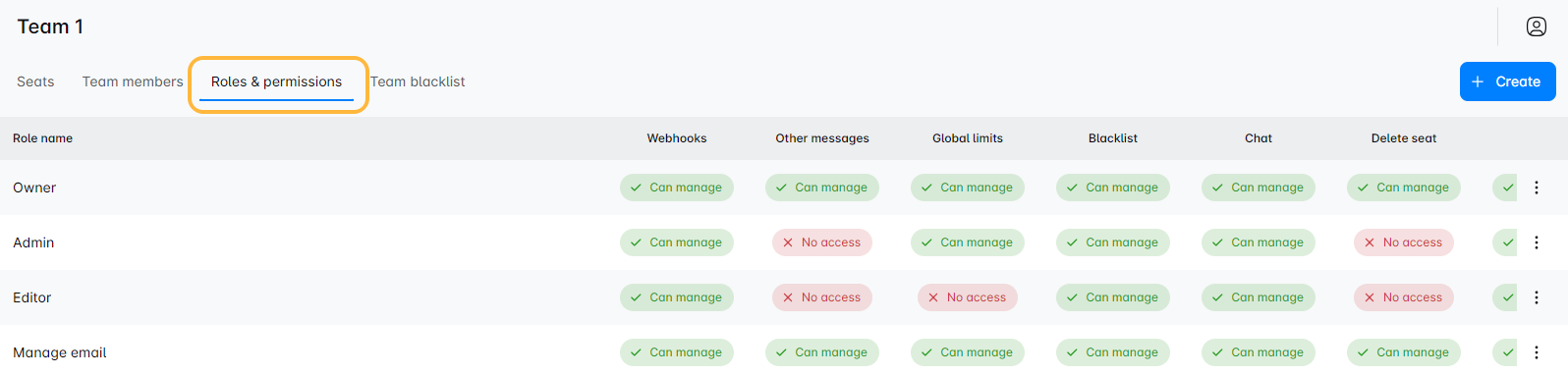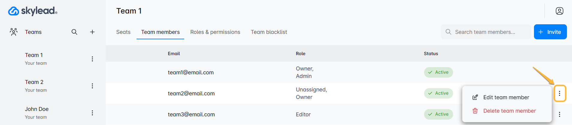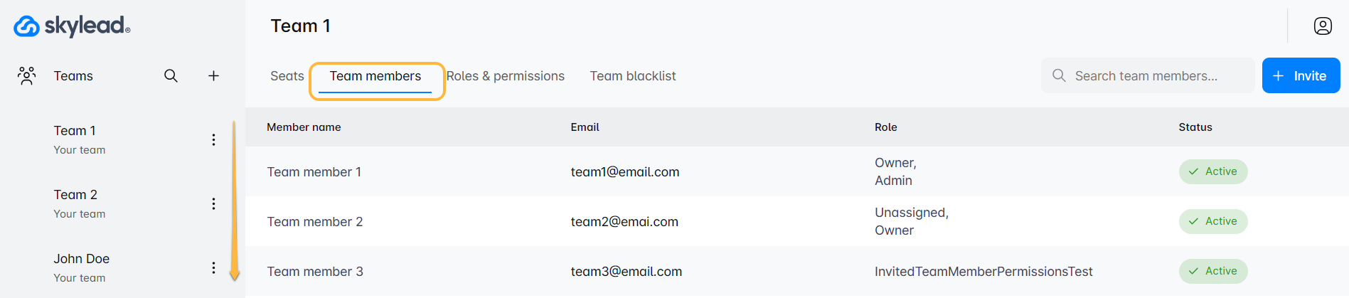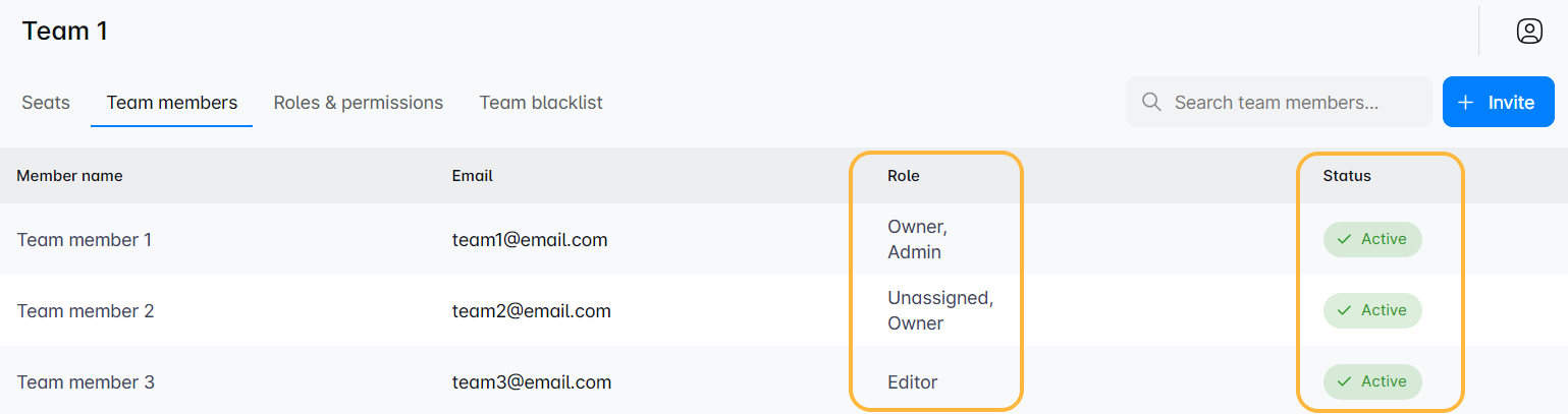 'टीम सदस्य' टैब पर क्लिक करें अपनी टीम की वर्तमान लाइनअप का अवलोकन करने के लिए जहां आप सभी की भूमिकाएं देख सकते हैं, नए सदस्यों को आमंत्रित कर सकते हैं, और अधिक।