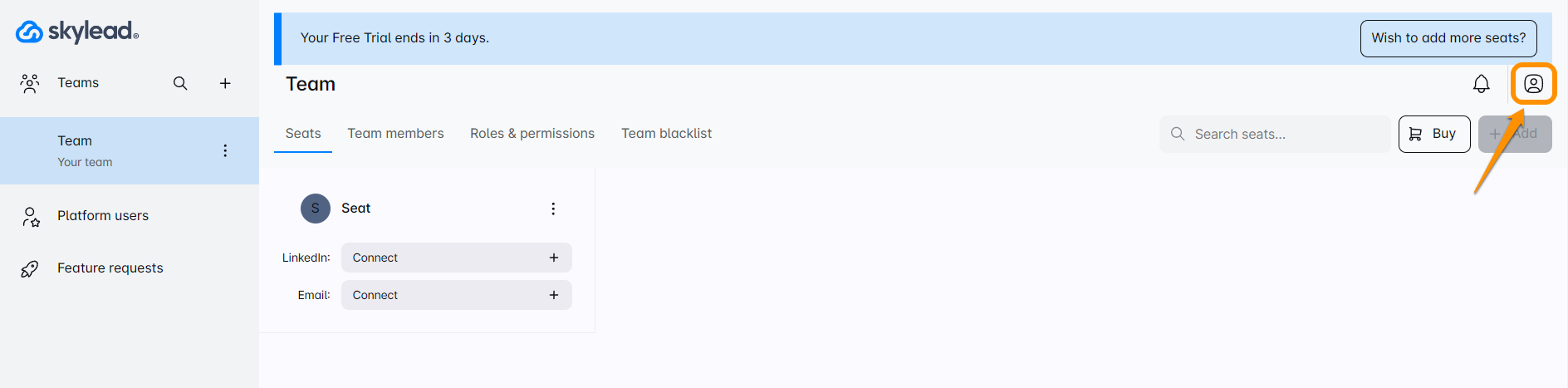 - आपकी API कुंजी इस इंटीग्रेशन खजाने की एक गुप्त कुंजी की तरह है! आप इसे आसानी से अपने Skylead खाते में पा सकते हैं। बस इस खाता आइकन पर क्लिक करें —यह वह जगह है जहां सभी महत्वपूर्ण चीजें रहती हैं! ⚙️