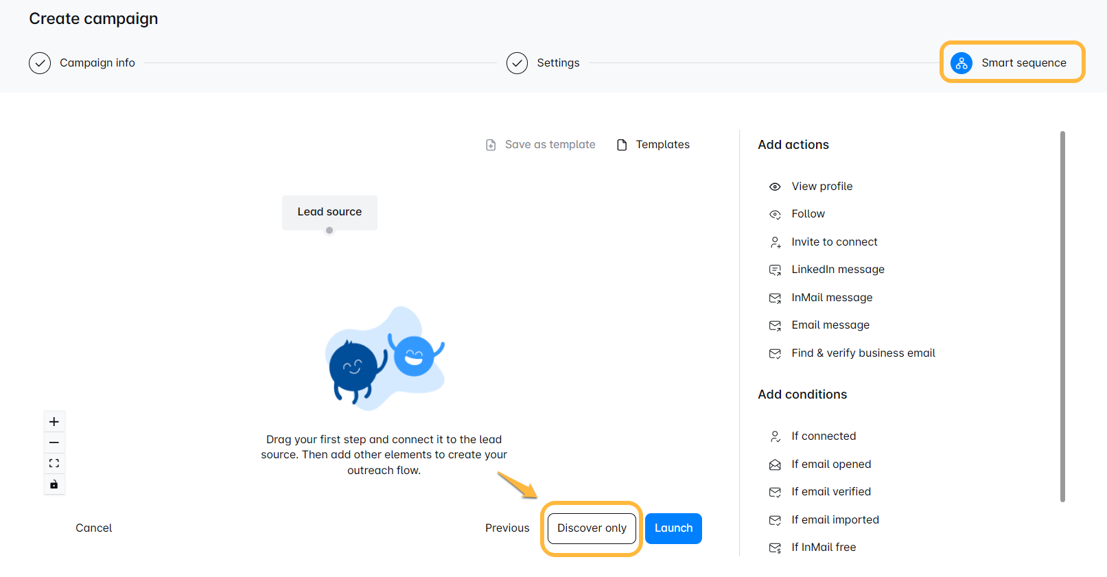और बस इतना ही! 'केवल लीड्स खोजें' सुविधा एक सरल लेकिन शक्तिशाली उपकरण है जो आपके सफल अभियानों को ईंधन देने के लिए आवश्यक लीड्स को एकत्रित करने के लिए है।