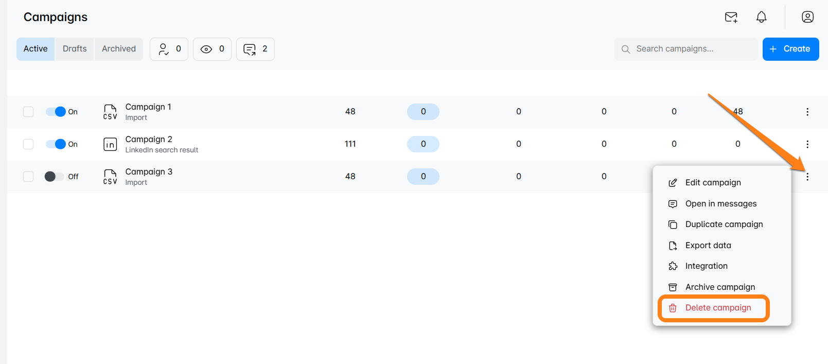 क्या आपको अपना डैशबोर्ड साफ करने की आवश्यकता है? Skylead में एक अभियान को हटाना बहुत आसान है! हम आपको दिखाएंगे कि अपने अभियान को कैसे खोजें, विकल्पों तक कैसे पहुंचें, और इसे कैसे हटाएं। आप कई हटाने कैसे करते हैं और आप सभी अभियान डेटा खोए बिना उन्हें बाद में संग्रहीत करने के लिए 'Archive' का उपयोग कैसे करते हैं।