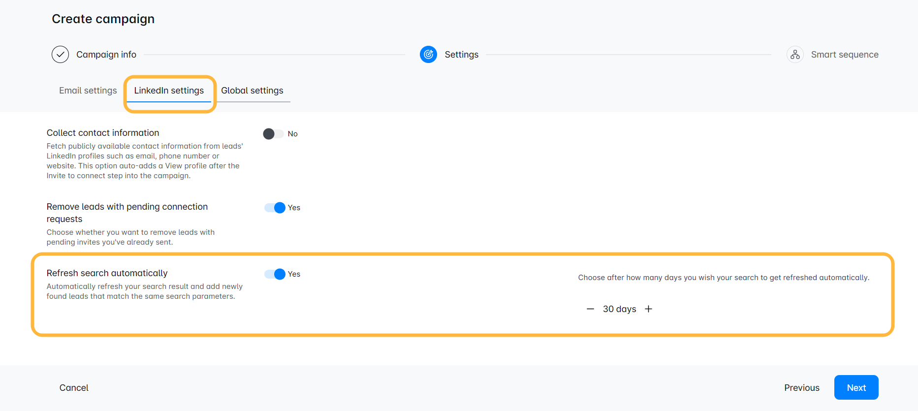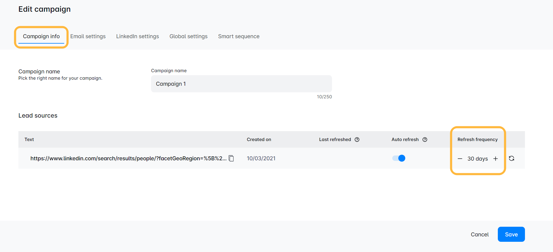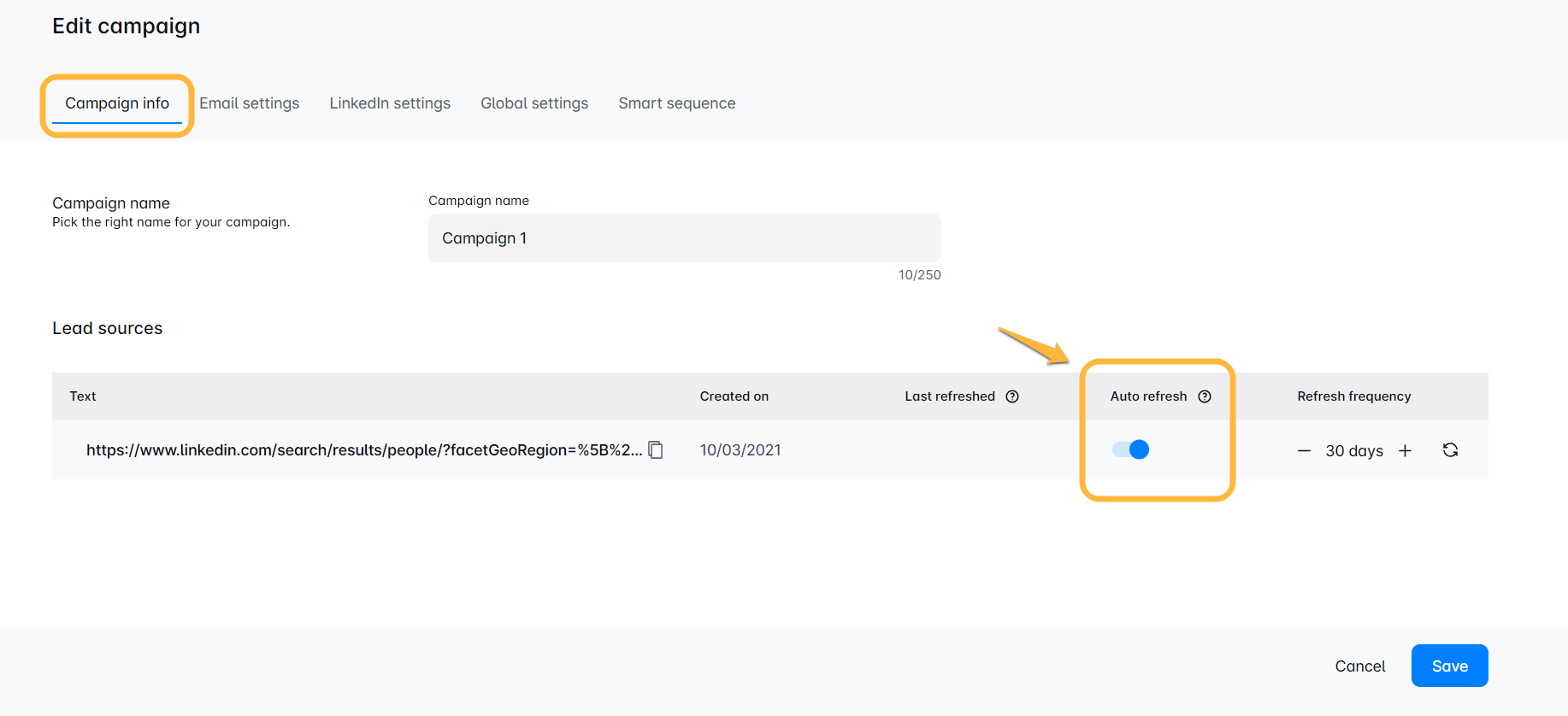 - टैब 'अभियान जानकारी', पर आप यहां Refresh search को सक्षम करने का विकल्प देखेंगे: