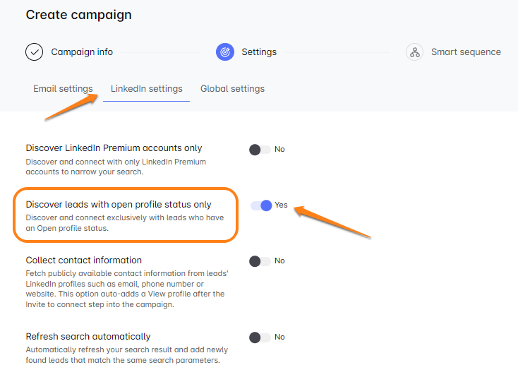 केवल InMail अभियान सेट कर रहे हैं? LinkedIn सेटिंग्स में "केवल ओपन प्रोफाइल स्थिति के साथ लीड्स खोजें" को सक्षम करना सुनिश्चित करें। यह उन प्रोफाइलों पर ध्यान केंद्रित करता है जो मुफ्त InMails स्वीकार करते हैं, प्रतिक्रियाओं को अधिकतम करते हैं! Skylead प्रति माह 800 मुफ्त InMails प्रदान करता है, और स्मार्ट सीक्वेंस भी दक्षता के लिए भुगतान और मुफ्त InMails को मिलाता है। सगाई को बढ़ावा देने के लिए तैयार हैं? आज ही इसे आजमाएं! 🚀