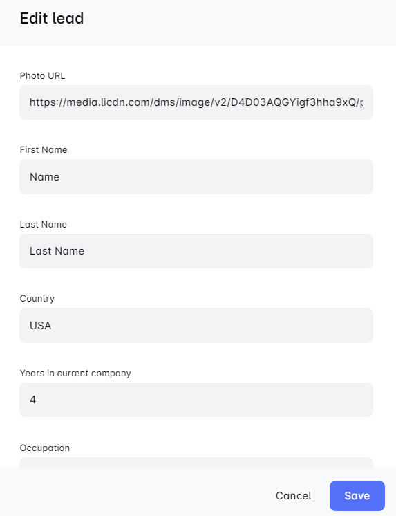 - जैसे लीड के नाम या वर्तमान कंपनी जैसी जानकारी को अपडेट करने के लिए, बस वह नई जानकारी जोड़ें जो आप चाहते हैं।
