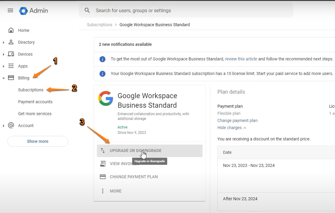 Buka menu utama dan klik Penagihan > Langganan di Konsol Admin. Kemudian, klik pada paket yang dipilih dan Upgrade atau Downgrade.