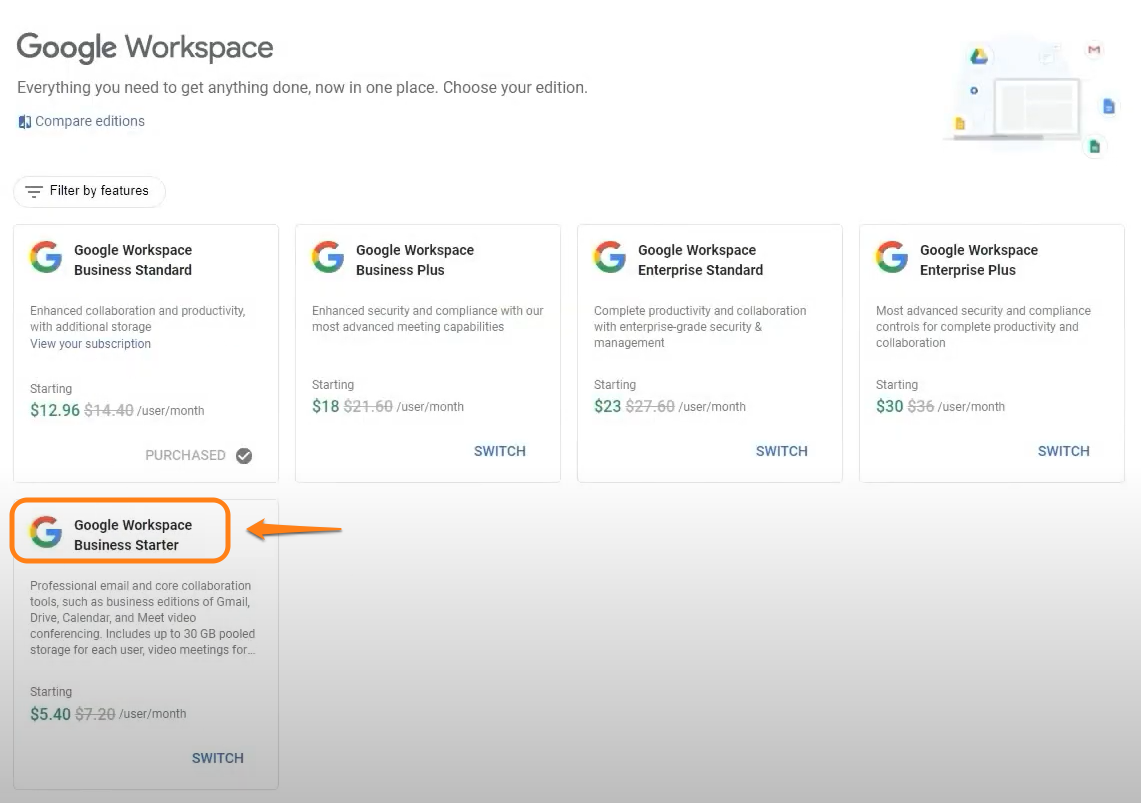 Karena Google Workspace tidak menawarkan paket lain selain Business Standard yang paling populer, Anda dapat & harus pergi dan mengubahnya ke paket yang lebih terjangkau.