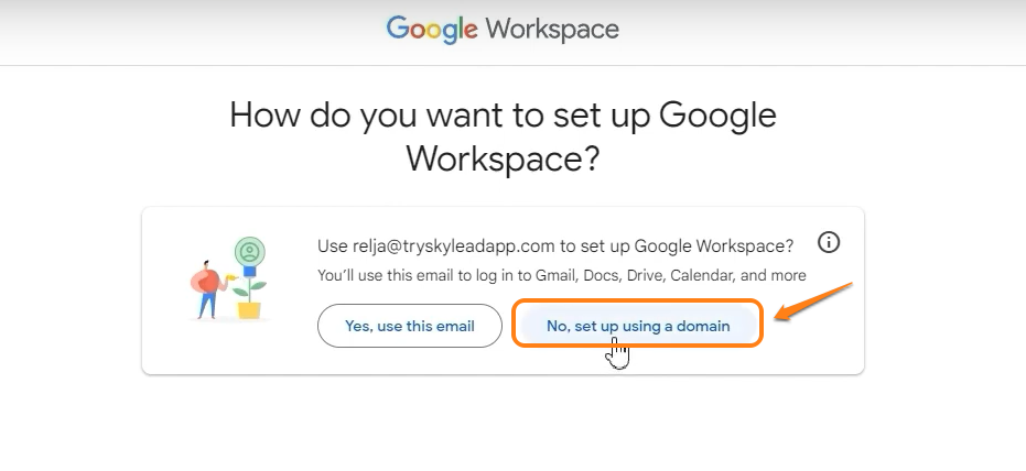Saat kita sampai di layar ini, di sinilah kita menghubungkan ruang kerja baru kita dengan domain alternatif kita, jadi klik "Tidak, atur menggunakan domain." Kemudian, Anda akan sampai di layar di bawah ini. 👇