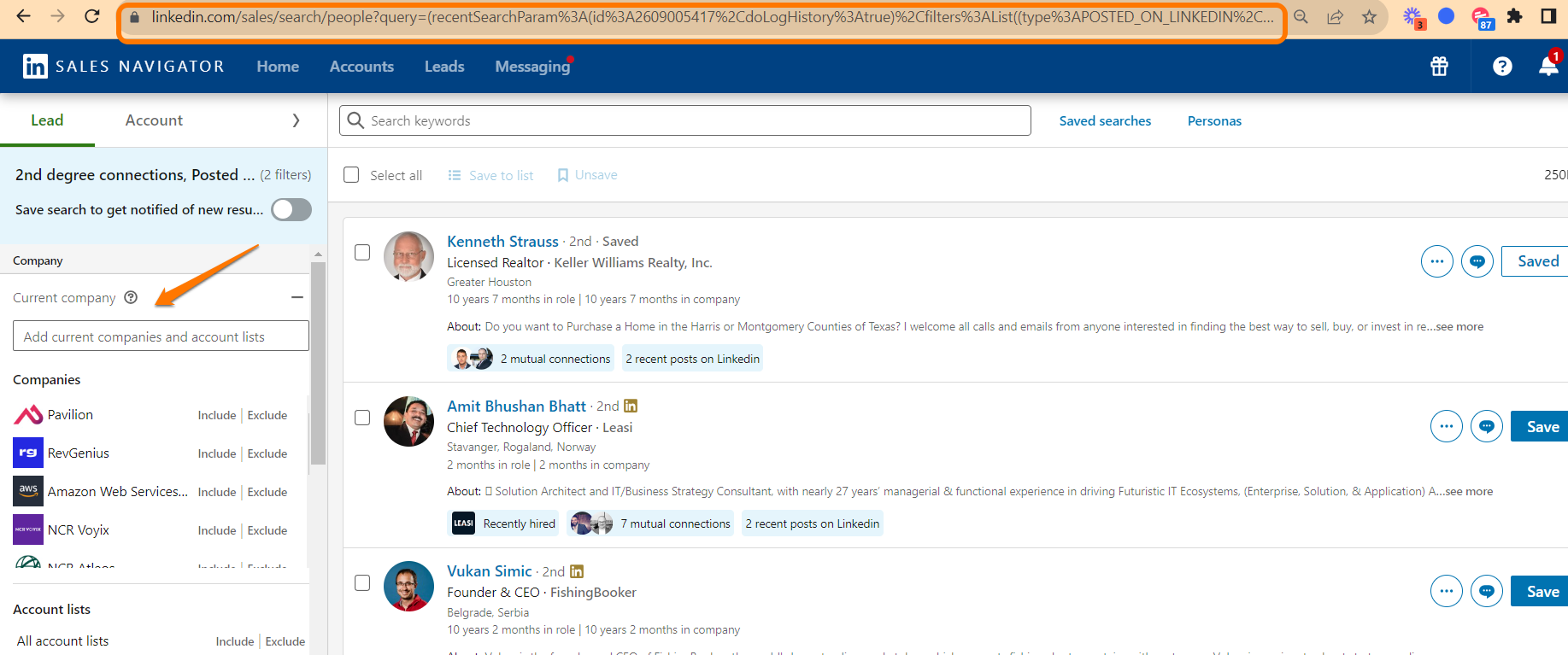 Hier is een snelle truc om een Opgeslagen Zoekopdracht om te zetten in een gewone in Skylead! Open je Opgeslagen Zoekopdracht, voeg een filter toe en verwijder deze, en kopieer de bijgewerkte URL zonder "savedSearch." Nu heb je een gewone zoekopdracht klaar voor aangepaste aanpassingen. Veel zoekplezier, en mogen je campagnes schitteren! 🔍✨