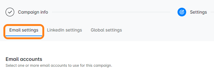 Når du har passert det første trinnet i kampanjeopprettelsen, kommer du til siden 'Kampanjeinnstillinger'. Her ligger kontrollpanelet for kampanjen din. Naviger og finn fanen 'E-postinnstillinger' øverst.