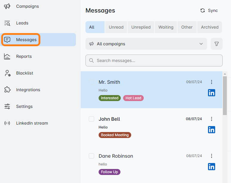 Aqui, você encontrará todas as suas mensagens do LinkedIn, Sales Navigator, InMails e Emails em um espaço organizado. Basta clicar no ícone da página de Mensagens (Smart Inbox) para acessar, visualizar e responder aos leads.