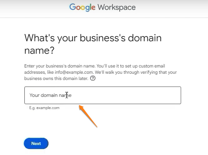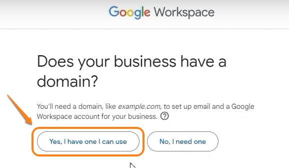 När vi kommer till denna skärm, är det här vi kopplar vårt nya arbetsutrymme med vår alternativa domän, så klicka på "Nej, ställ in med en domän." Sedan kommer du till skärmen nedan. 👇