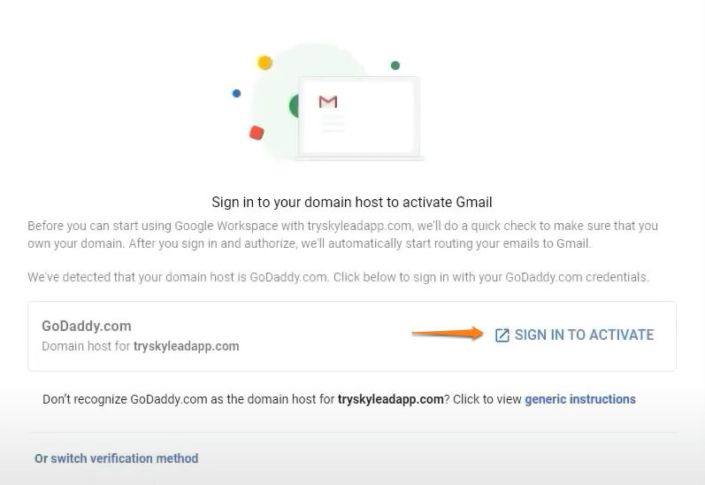 Efter föregående steg öppnas en ny flik där du kan logga in på din domänvärd med en enkel inloggning för att aktivera Gmail.