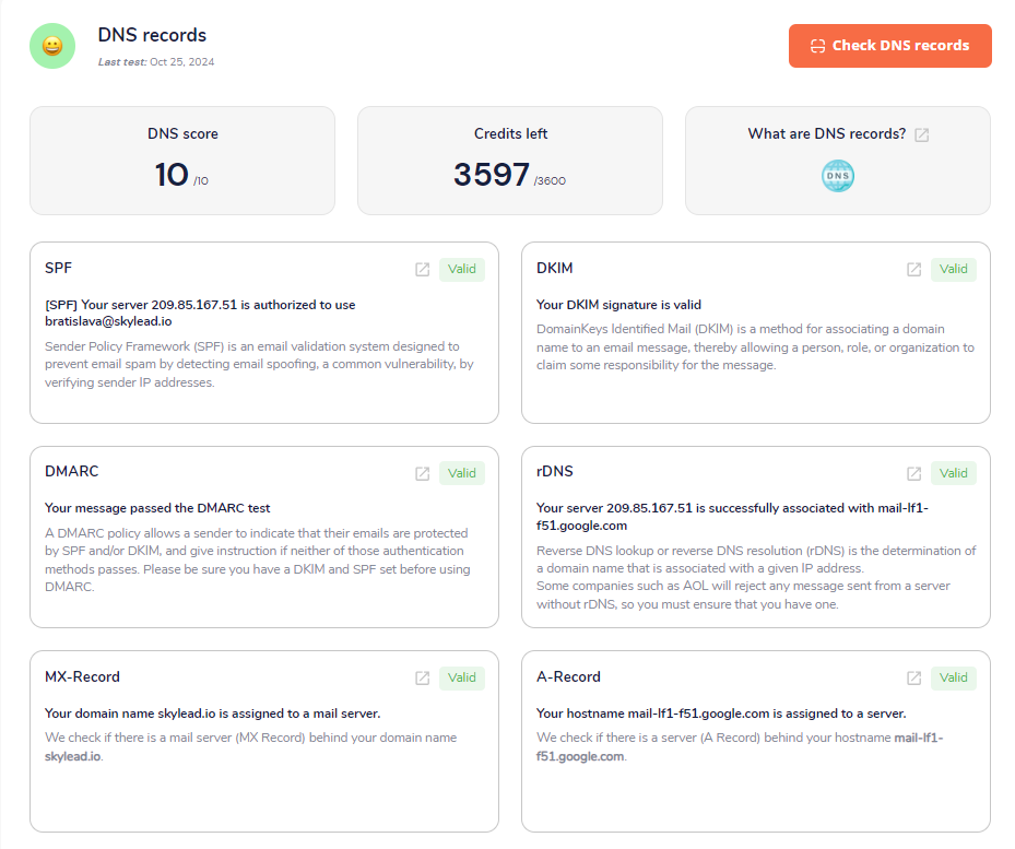 2. Du kan också dra nytta av DNS-record check. Verktyget visar om alla DNS-poster är i ordning så att du kan fortsätta med säker outreach. Om du inte har ställt in dem korrekt, som vi har lärt oss i Nivå 4 & Nivå 6, är det här det kommer att visas, så att du kan rätta till det och optimera.