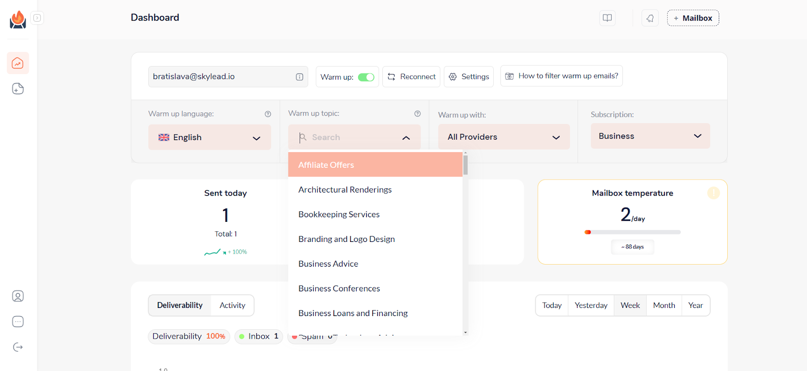 3. Välj specifika ämnen för e-post - Det är här Warm up topic kommer in. Du kan välja ett ämne för ditt konto, och det kommer att generera uppvärmningsmejl för specifika branscher, vilket hjälper dig att anpassa din uppvärmning ytterligare.
