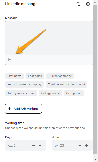 - E-posta mesajları için resminizi veya GIF'inizi nereye ekleyeceğinizi seçin. LinkedIn mesajları ve InMail'ler için, Skylead kişiselleştirilmiş resimlerinizi ve GIF'lerinizi mesajın altına yerleştirecektir.