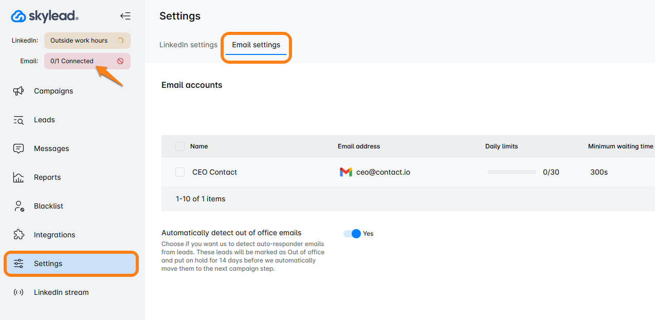 首先導航到‘設置‘頁面,然後在 Skylead 的‘電子郵件設置’標籤中。這是您所有設置和電子郵件配置的中心樞紐。 🎮